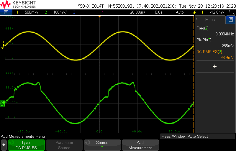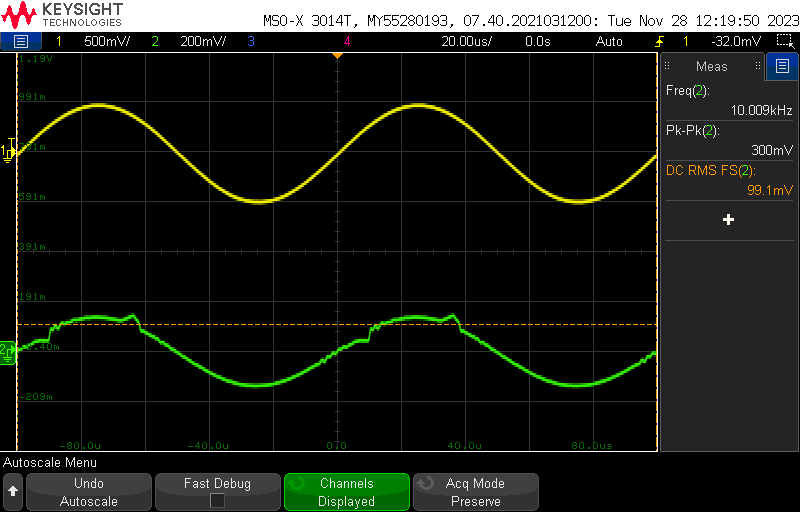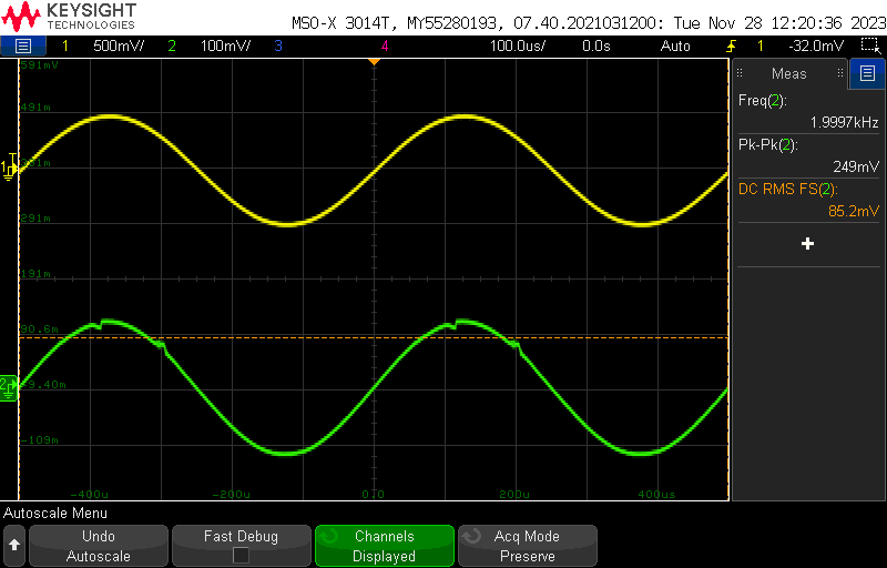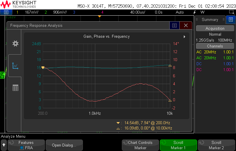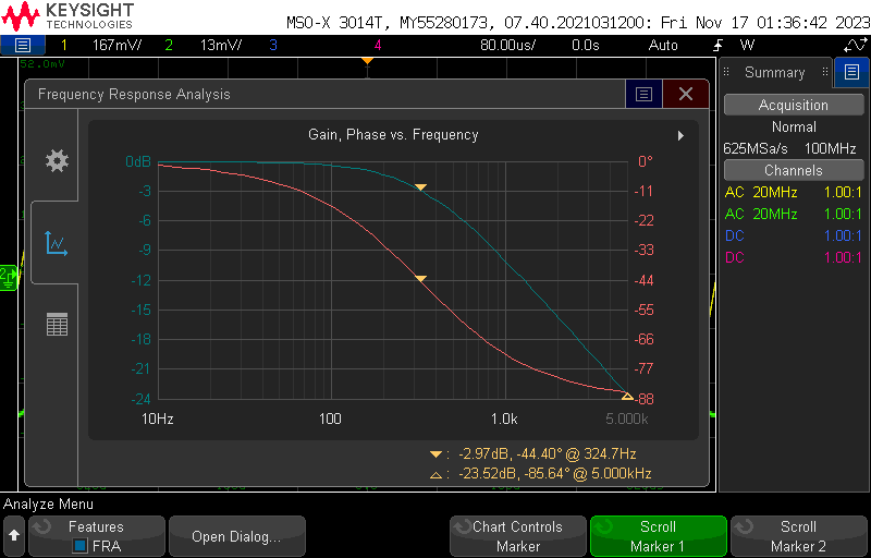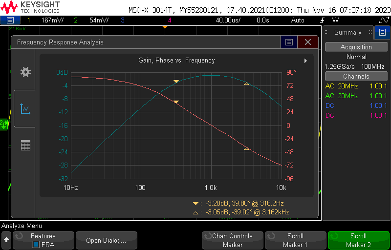 The approach involved breaking the complex circuit down into smaller, testable components. I first designed and constructed the individual filters: a low-pass filter with a cutoff at 320 Hz, a high-pass filter with a cutoff at 3200 Hz, and a mid-pass filter built by combining a high-pass and low-pass filter with a buffer in between. Each filter’s gain was then controlled using an inverting op-amp with a potentiometer to allow for adjustable volume. All the filtered signals were then fed into a summing amplifier for master volume control before being sent to a power amplifier to meet the output power requirement. I used a Keysight oscilloscope to perform frequency analyses and measure voltage values to ensure each component met the specified constraints.