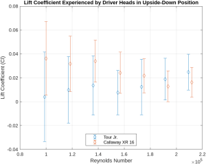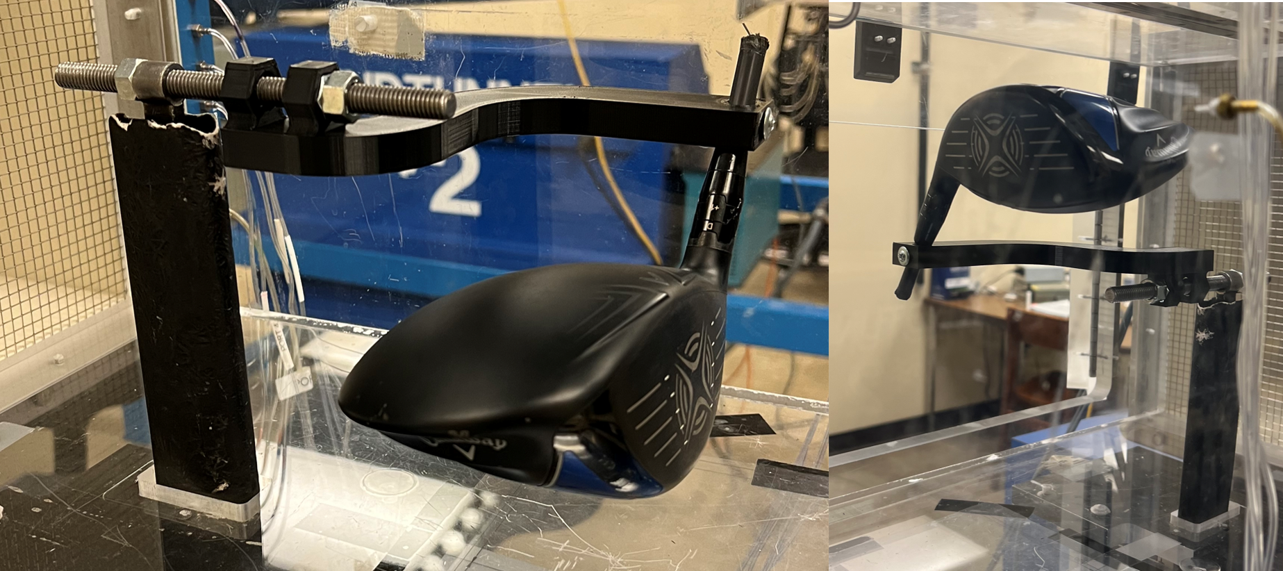 Our team used a low-speed wind tunnel to test both the high-end Callaway XR 16 Driver Head and the low-end Tour Jr. Driver Head. We mounted each club head to a custom fixture connected to a dynamometer and a Linear Variable Differential Transformer (LVDT) to accurately measure drag and lift forces. We collected data at various wind speeds and in different orientations to see how the aerodynamic properties of each club behaved under different conditions. This allowed us to calculate the drag (Cd) and lift (Cl) coefficients to make a quantitative comparison.