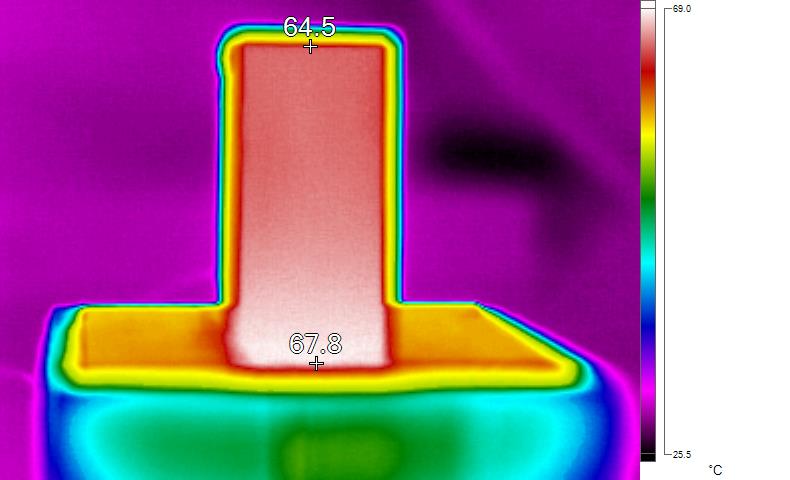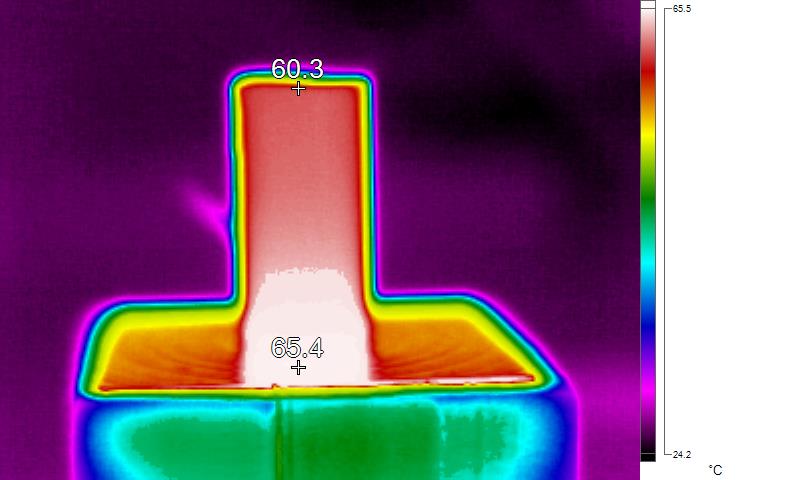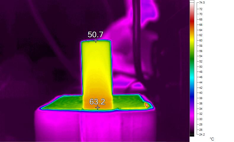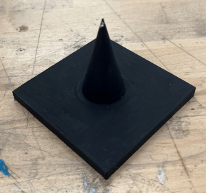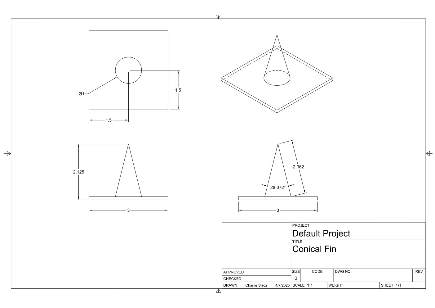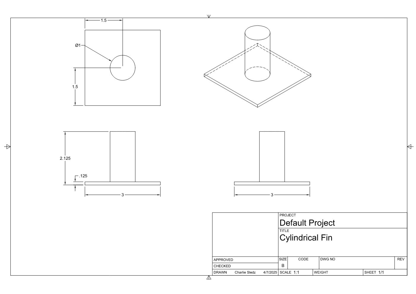 Our team designed and machined three fins (rectangular, cylindrical, and conical) from a single block of Aluminum 6061 to eliminate thermal contact resistance. Each fin, including its base plate, was constrained to a volume of 2 inches in height, 1 inch in width, and 1 inch in depth. We placed each fin on an electric heater within an insulated block and subjected it to a constant 5 m/s airflow from a blower. We used thermocouples and an IR camera to collect temperature data until a steady-state condition was approximated. Using this data, we performed analytical calculations to determine the fin’s heat rate, fin efficiency, and two primary metrics: volumetric efficiency and mass efficiency.