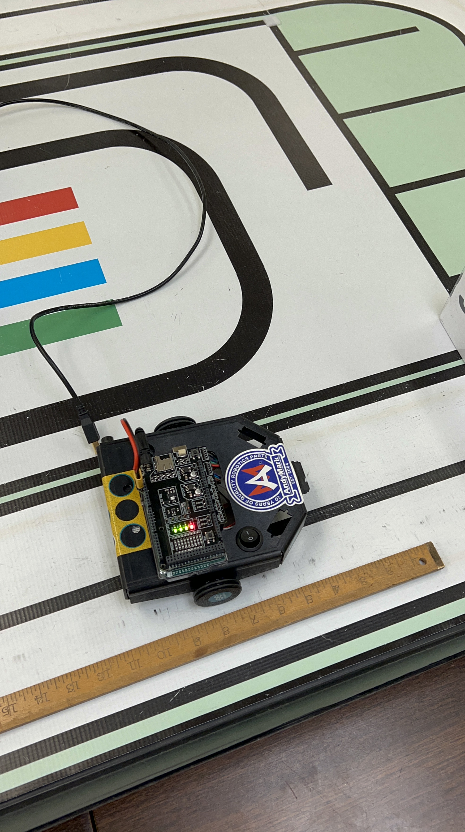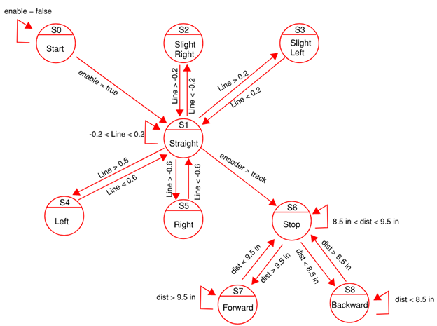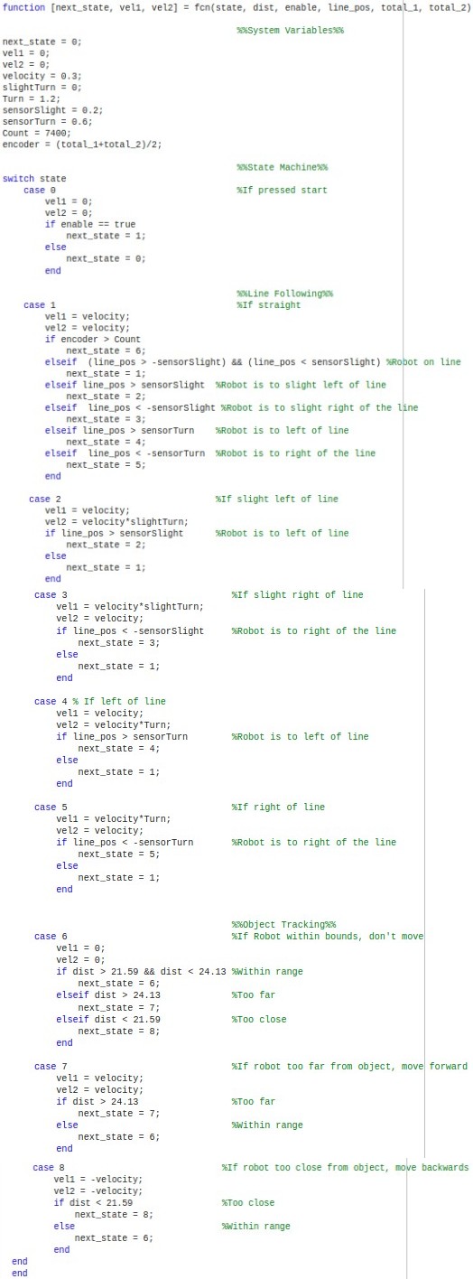 The control system was built around a state machine that dictated the robot’s actions based on real-time sensor inputs. For the line-following portion, the robot used a line follower sensor to make micro-adjustments to its wheel speeds to stay on the track. The movement was divided into five distinct states (e.g., Straight, Slight Right, Large Left) to ensure accurate navigation. After one lap was completed, the encoder values from the wheels were used to trigger the transition to the object-tracking mode. In this mode, an ultrasonic sensor was used to maintain a distance of approximately 9 inches from an object, with the robot moving forward, backward, or stopping as needed. We used PID controllers to regulate the motor speeds and friction compensation to ensure smooth, precise movements in both modes.